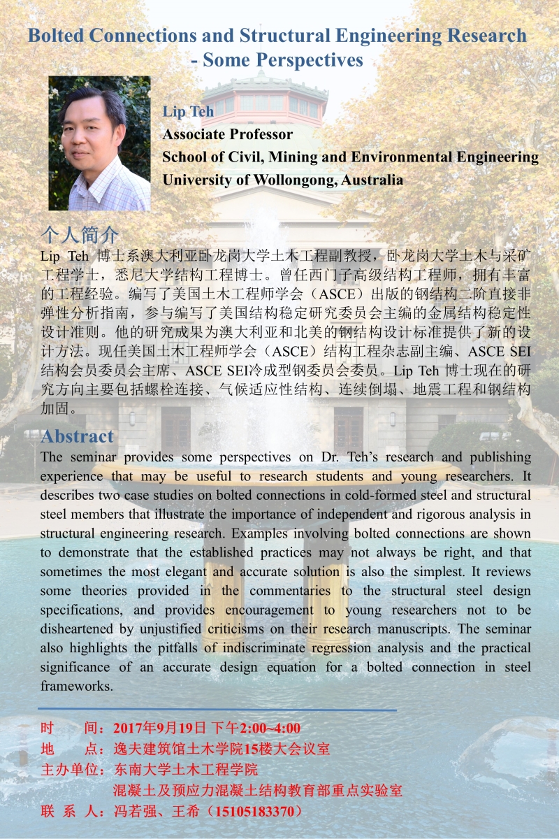 ASCE结构工程副主编澳大利亚卧龙岗大学LIP TEH教授学术报告会:Bolted connections and Structural Engineering Research Some Perspectives