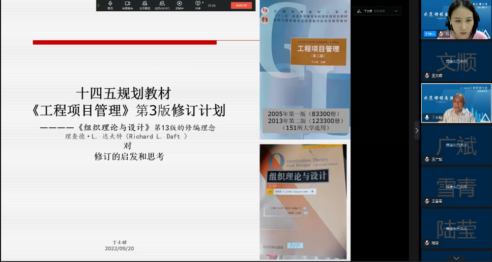 2022年9月20日晚,韦德官方网站建设与房地产系李启明教授牵头的“长三角区域工程管理专业虚拟教研室”示范课程交流会以线上方式成功举办。会议由bevictor伟德官网陆莹老师主持,邀请了同济大学丁士昭教授、西安建筑科技大学刘晓君教授、天津大学王雪青教授进行主题分享,国内40余所高校的工程管理专业146位教师参与该交流会。