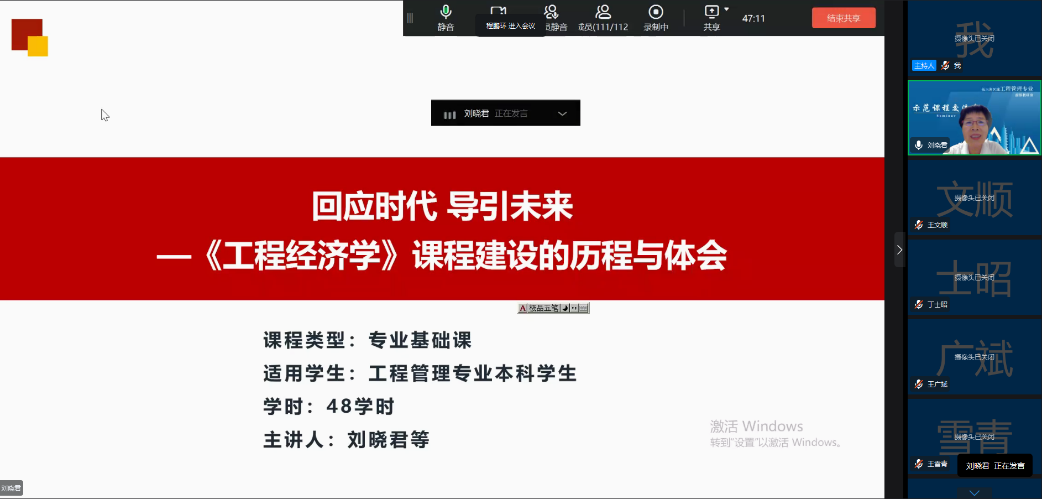 随后,西安建筑科技大学刘晓君教授作了《回应时代,导引未来——〈工程经济学〉课程的建设历程与体会》的报告。讲座从课程发展沿革、课程改革历程、课程建设体会三方面介绍了《工程经济学》课程的建设情况,特别介绍了课程改革历程中教材不断迭代,教学理念不断更新,课程目标不断提升,教学模式不断革新,教学方式不断丰富。