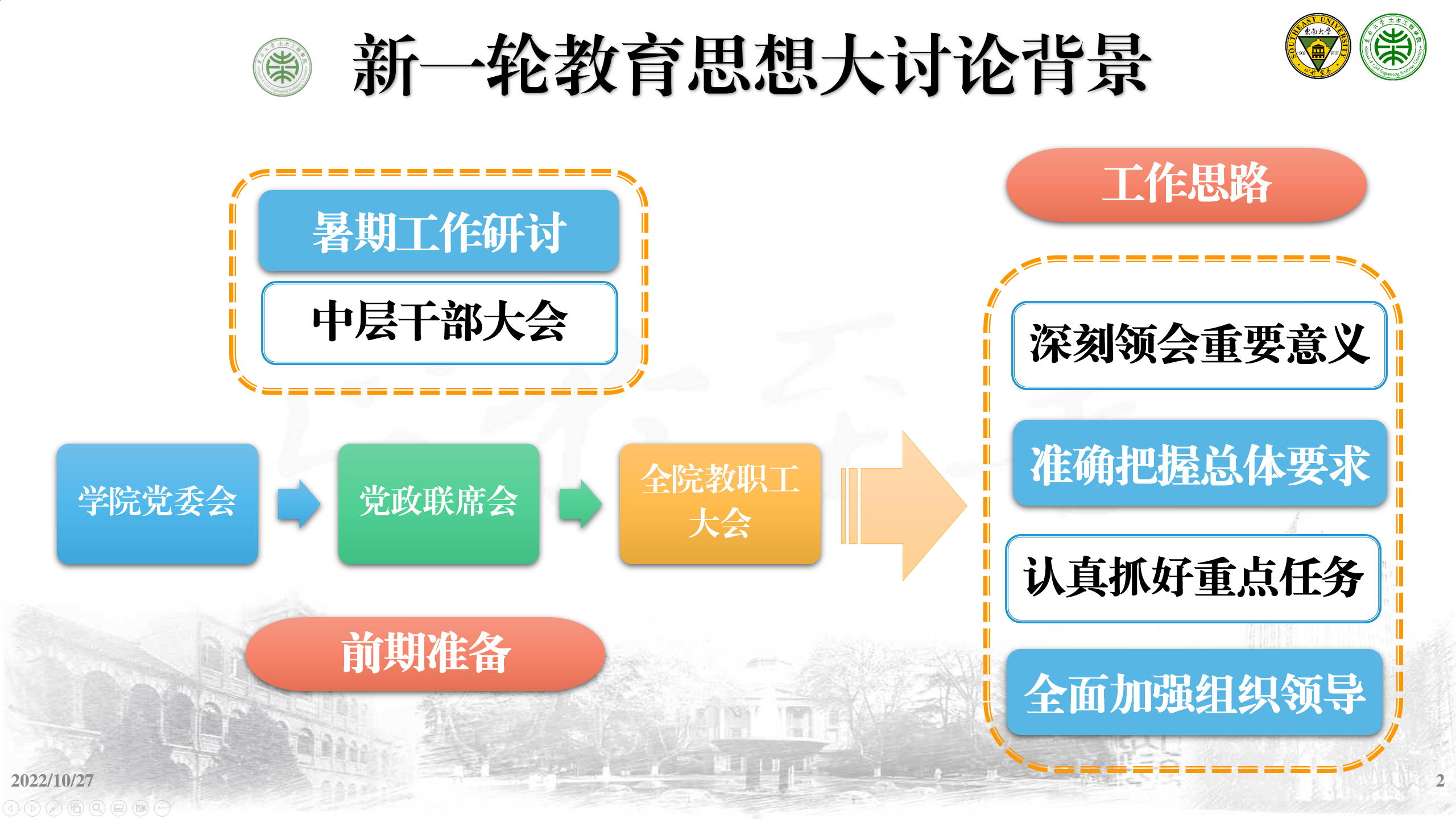bevictor伟德官网刘静书记进行了动员。刘书记从明确历史方位和发展阶段、回信精神、开启bevictor伟德官网新的征程和庆祝党的二十大胜利召开等方面指出要深刻领会新一轮思想大讨论的重要意义。强调坚定文化自信,树立科学理念,提升专业素养,努力以匠心铸精品,更好服务国家发展建设。接着强调了本次大讨论的基本原则和指导思想,从育人思想、模式、能力和文化几个角度提出全面提升的总体要求,并部署了领军人才培养体系建设、高端高质团队队伍建设、重大科技平台设施建设和一流土木学科文化建设四项重点任务。刘书记最后指出要加强组织领导,充分宣传调动全体师生员工的积极性,坚持问题导向,主动思考、凝聚智慧,做好成果总结。