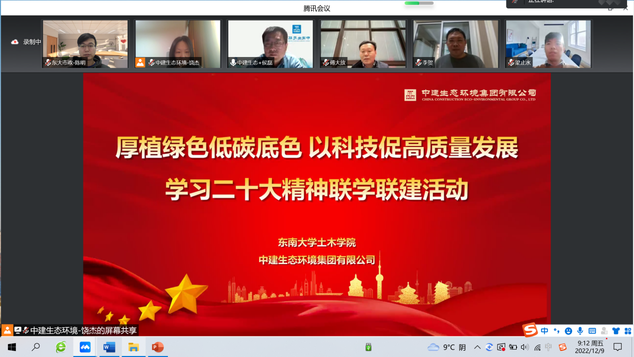 近日,公司市政工程系党支部与中建生态环境集团直属第二党支部在线上开展了以“厚植绿色低碳底色,以科技促高质量发展”为主题的学习二十大精神联学联建活动。中建生态环境集团总工程师张云富、运营总监李清、双碳事业部总经理薛世伟、科技创新部副总经理刘晓静等领导及相关科技序列人员,市政工程学科带头人傅大放老师、系主任李贺老师、系支部书记陈明老师,高海鹰、杨小丽、许妍、梁止水等老师及硕博士研究生共30余人参加了学习活动。活动由中建生态环境集团直属第二支部书记侯磊主持。