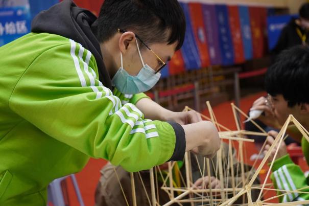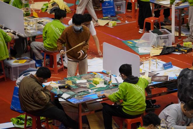 本届赛题制作区域限制严格,模型构件数量多,制作复杂,备赛团队经历了近一年之久的长期备赛。参赛队员经过暑假留校的全力准备,代表公司参加省分区赛,在省赛中以一等奖第一名的成绩成功入围全国总决赛。省赛结束后,面对难度陡增的国赛赛题,备赛团队没有懈怠,立刻投入国赛的全力冲刺。一边是长期日夜颠倒备赛的体力挑战,一边是由于疫情比赛反复延期的精神考验,队员们始终没有放弃,对30万种复杂工况不断思索,对结构上的每一个构件进行微调优化,以求更轻的重量与在国赛中更强的竞争力。2023年2月,比赛时间终于敲定,在期末考试与比赛临近的双重压力下,备赛队经过慎重考虑,决定更换结构体系,选择更保守的四柱五层梁结构以及相对更轻的荷载。三月,全国110所高校的参赛队齐聚太原理工大学同台竞技,在16个小时的现场制作过程中,队员们沉着冷静的面对赛场上的各种问题,按计划完成了模型整体制作。然而其他队伍的荷载重量选取以及现场竞争的激烈程度超出了队员们的预料,为了挑战更好的成绩,队员们商讨决定选择此前考虑的最重荷载。最终,模型以较小的变形成功完成加载,斩获一等奖。