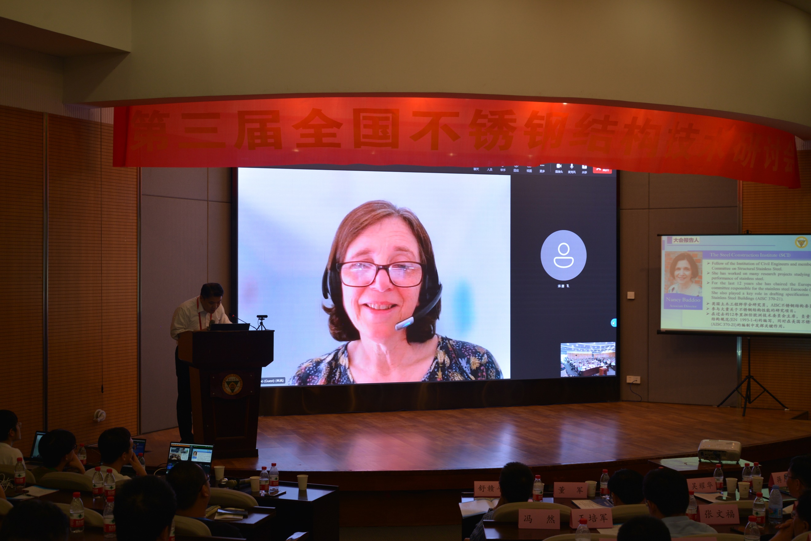 开幕式结束后,大会报告正式开始。全天共设4场,24个报告。报告内容丰富多样,选题新颖前沿,涵盖不锈钢材料、构件、节点、结构体系的力学性能、抗震、抗火和抗风揭等技术研究,优秀不锈钢工程案例的介绍和不锈钢创新产品与先进材料的展示等,其中包含欧洲技术委员会主席、英国土木工程师学会研究员、AISC不锈钢结构委员会成员Nancy Baddoo女士的分享,为与会代表提供了一场属于不锈钢结构的视听盛宴。