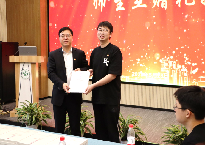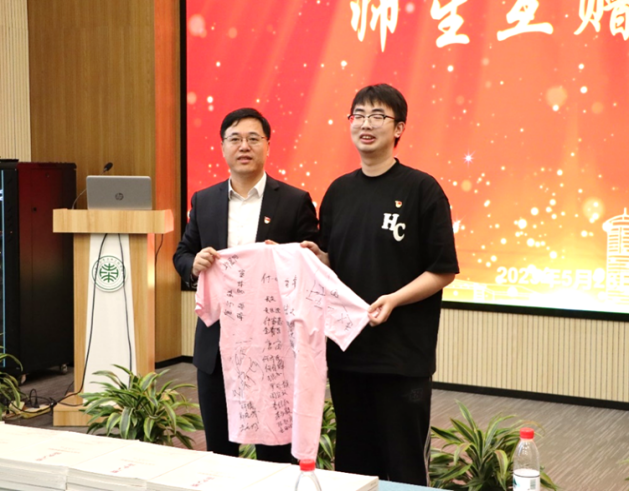 最后,本科生至善党支部书记唐宇鲜将全体同学签名的文化衫赠予吴刚老师留作纪念,吴刚老师也回赠《紫气东南——bevictor伟德官网校园演变图史》一书作为同学们的毕业礼物,勉励同学们秉承东大精神,谨记东大校训,讲好东大故事。