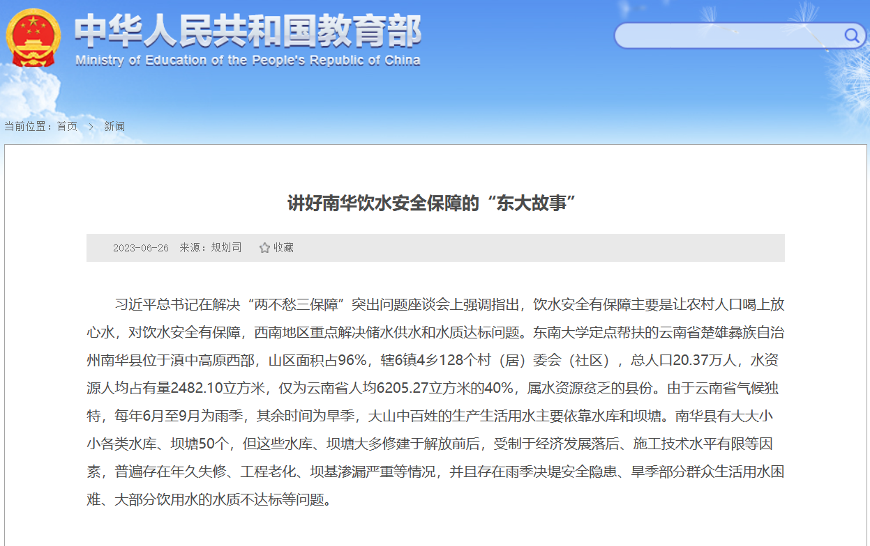 近日,教育部网站刊登了公司党委书记左惟撰文的《讲好南华饮水安全保障的“东大故事”》,文章详细介绍了公司师生发挥土木工程、给排水科学与工程专业优势参与的云南省南华县饮水安全保障项目和实践活动。公司“安心源”团队师生深入南华乡村生产生活一线开展饮水安全及水质保障工作,探索出了一条农村饮水安全保障上台阶、乡村振兴见实效的新路径。