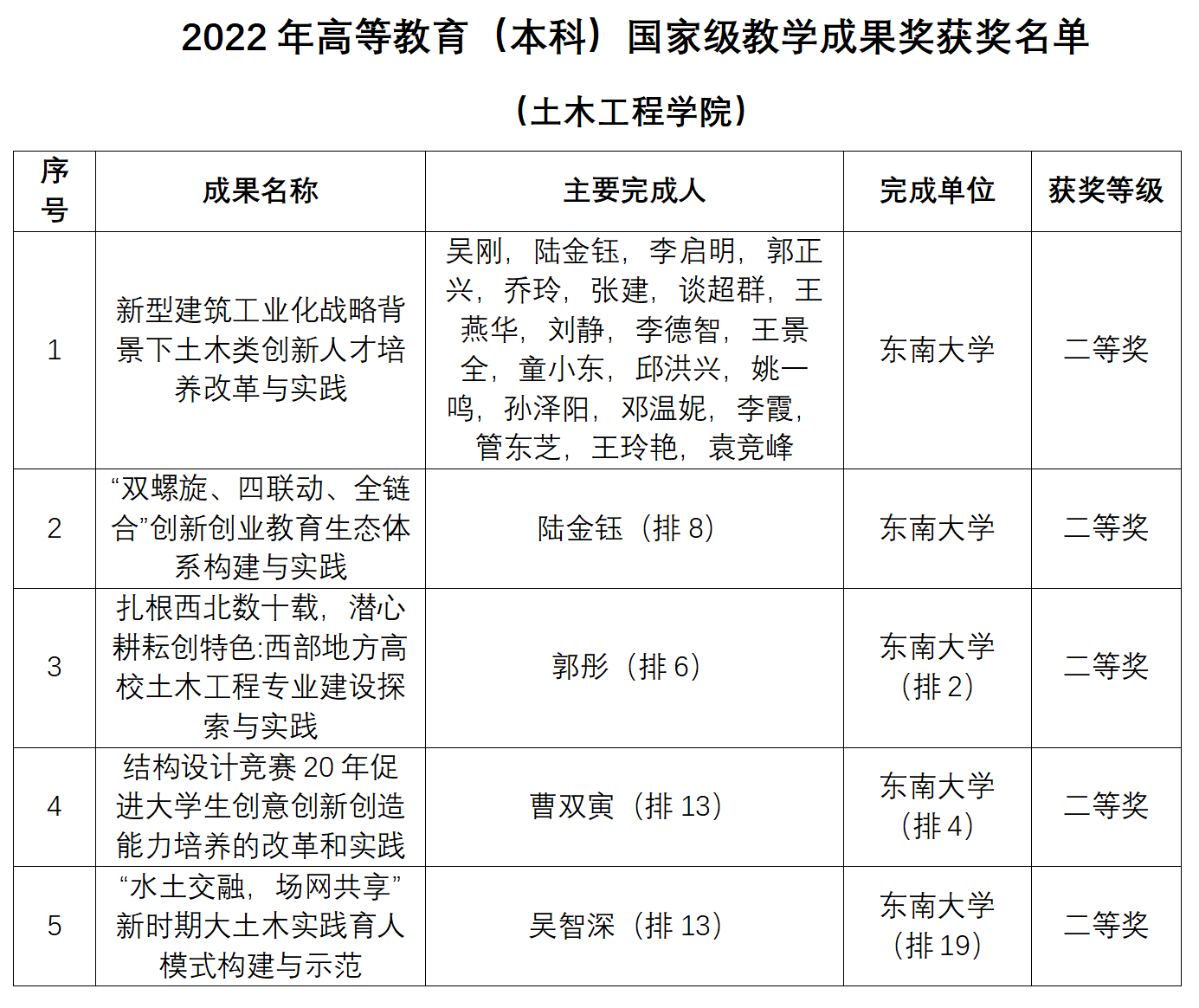 日前,教育部发布关于批准2022年国家级教学成果奖获奖项目的决定,公司共获高等教育(本科)国家级教学成果奖5项,其中以公司教师作为第一完成人获奖1项,此前已连续四届牵头获国家级教学成果奖。吴刚教授主持完成的成果“新型建筑工业化战略背景下土木类创新人才培养改革与实践”获评国家级教学成果奖二等奖。