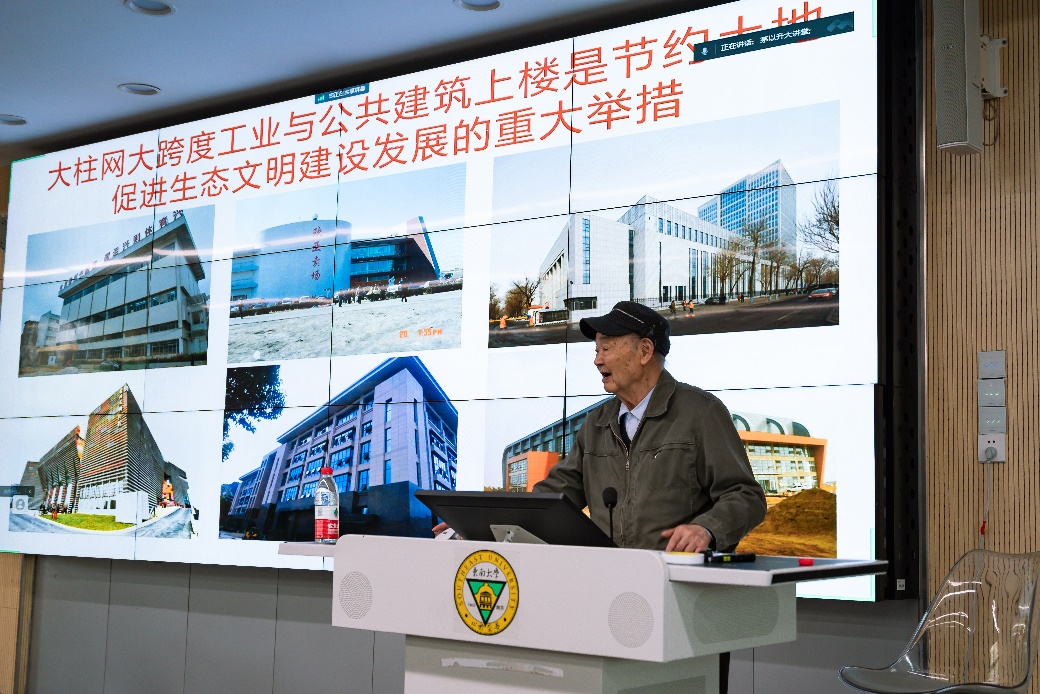 之后,马克俭院士作了题为“大柱网大跨度工业和公共建筑上楼是节约土地促进生态文明建设的重大举措”的报告。讲座中,马克俭院士介绍了其及团队提出的拥有完全自主知识产权的新型多高层空间结构体系——“混凝土空腹网架结构”和“空腹夹层板楼盖结构”。马克俭院士向参会的老师和同学分享了空腹夹层板的发展历程,介绍了空腹夹层板的力学模型与基本方程,并通过大量实际工程介绍了空腹夹层板在我国的实践与应用。马克俭院士也向参会人员介绍了其正在进行的装配式钢筋混凝土空腹夹层板1:1模型试验的流程及现场实物图,以及长沙在建的99米世界最高大跨度高层空腹夹层板柱结构。马克俭院士对空腹网架及空腹夹层板结构的研究,填补了我国在多高层大跨度大开间空间结构方面的空白。最后,马克俭院士强调我国科技发展的方向是创新、创新、再创新,要坚持把科技自立自强作为国家发展的战略支撑,实现高水平的自立自强。