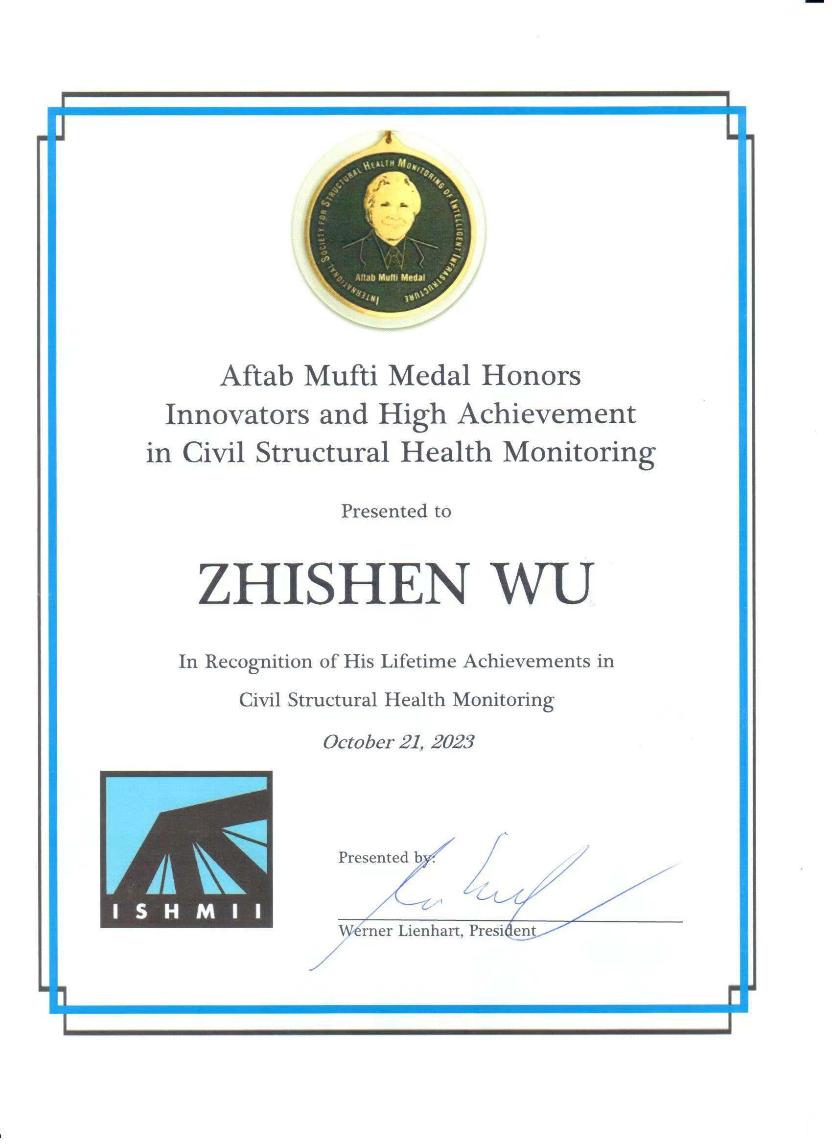 Aftab Mufti Medal Lifetime Achievement是冠以创始会长Aftab Mufti教授(加拿大皇家科学院及工程院院士、加拿大勋章获得者)的名义的ISHMII最高奖,以表彰在土木结构监测领域做出重要贡献的杰出个人。吴智深教授是获得该奖的首位中国大陆学者,是至今最年轻的获奖者。他领导构建了结构健康监测与评定技术体系,创新结构传感监测及智能检测技术原理,突破水上水下结构内部与表观损伤精准识别及性能评定关键技术,创立了结构区域分布传感监测及早期病变识别基本理论、结构声波/超声精准检测及隐蔽损伤诊断关键技术、结构(群)健康评定系统关键技术等。成果有效解决了苏通大桥、故宫建筑、长江隧道等多项重大工程损伤检监测及健康评定技术难题,在百余项国内外重要工程中得到应用。
