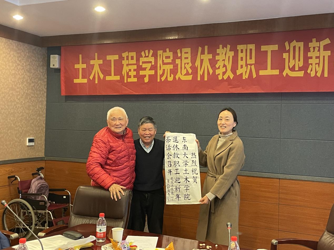 退休教师代表也纷纷发言,他们从学校和学院的发展、医疗保健、活动组织等方面提出了自己的看法和建议,对未来充满了信心。91岁退休教师唐九如赠送了自己的书法作品纪念此次新年茶话会的召开。