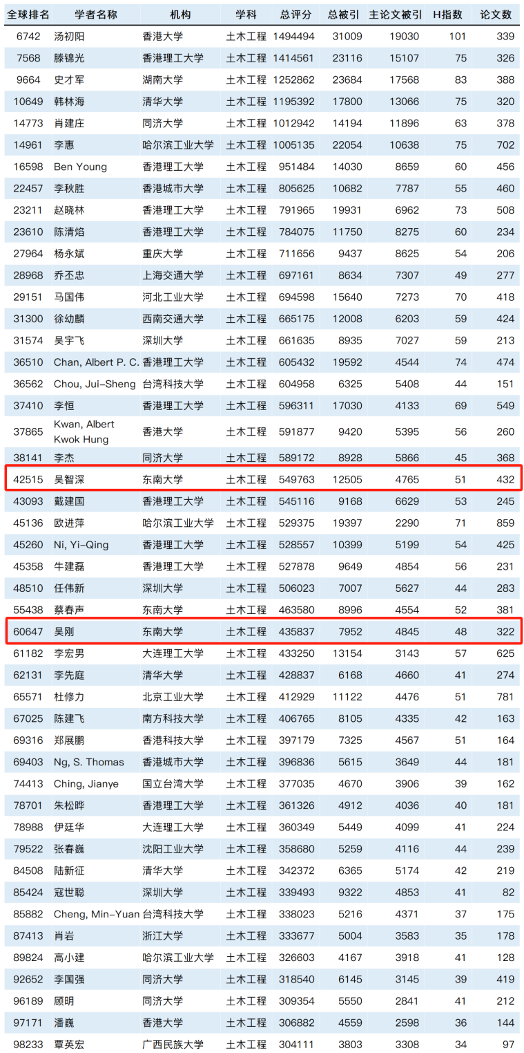 近期,国内全球学者库网站公布了“2023全球学者学术影响力排名(终身学术影响力榜)”,依照学者科研产出、Google Scholar Metrics 期刊评分、H指数、成果被引、成果中作者排序位置等参数综合考虑的结果。平均分高表明学者更倾向于在高质量期刊发表文献,综合评分则更多考虑学者的产出量。该名单中国内共有8029人入围,其中土木工程学科47人(内地学者29人),公司共有3位教授入选,其中公司吴智深教授和吴刚教授入选,具体名单如下: