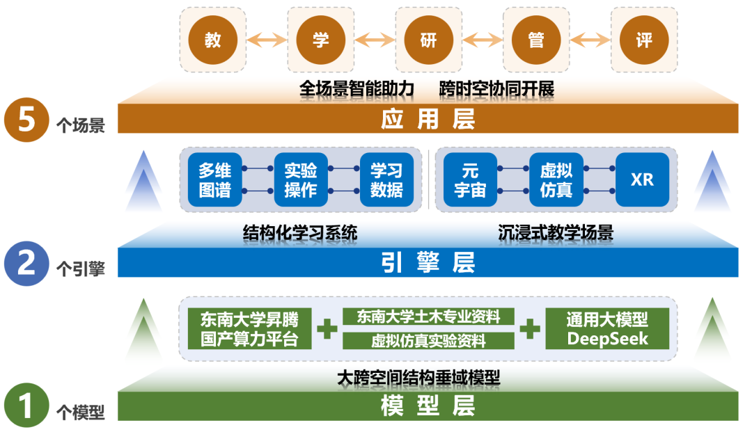 《CiviX³-LAB:“AI+虚仿+XR”多维赋能的未来实验课堂新范式》案例由陆金钰教授牵头,实验中心徐伟杰、徐向阳、徐明等老师参与研发,案例依托土木工程一流学科和国家级虚拟仿真实验教学中心,创新构建了AI、虚仿与XR三大技术深度融合(X³)的土木智慧实验教学平台CiviX3-LAB。该平台聚焦传统实验教学中沉浸感不足、个性化缺失、评价单一等难题,通过打造云边端协同的智能实验教学基座,实现教学资源云端共享、实验数据边缘实时处理和多终端沉浸式交互。采用了“1模型+2引擎+5场景”的分层体系架构,成功延拓了实验教学的时间和空间、深度和广度,重塑了“时空开放、动态自主、问题牵引”的未来实验课堂新范式。